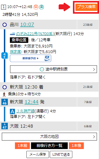 新幹線などの座席種別がある経路をご利用の場合に、あらかじめ利用したい座席の種類を設定して検索したり、プラス検索で座席種類を変更することで、お好みの検索結果を表示することが可能です。